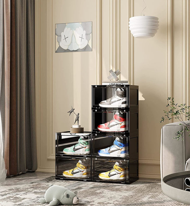 - MAGNETIC DOOR AND VENTILATE DESIGN:This shoe box organiser containers are built with upgraded magnets, and its door has two upgraded magnets that provide suction when the door is closed. The ventilation design ensures constant fresh air exchange,effectively preventing odor.